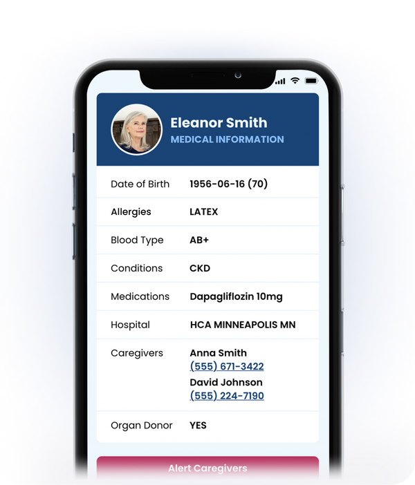 The Nomo app allows caregivers to easily create and maintain a digital health profile for their loved one. Caregivers can add medications, allergies, medical conditions, and other important information directly from their phone. Any updates made appear instantly when the bracelet is scanned, ensuring anyone who scans it has access to the most current and accurate information.