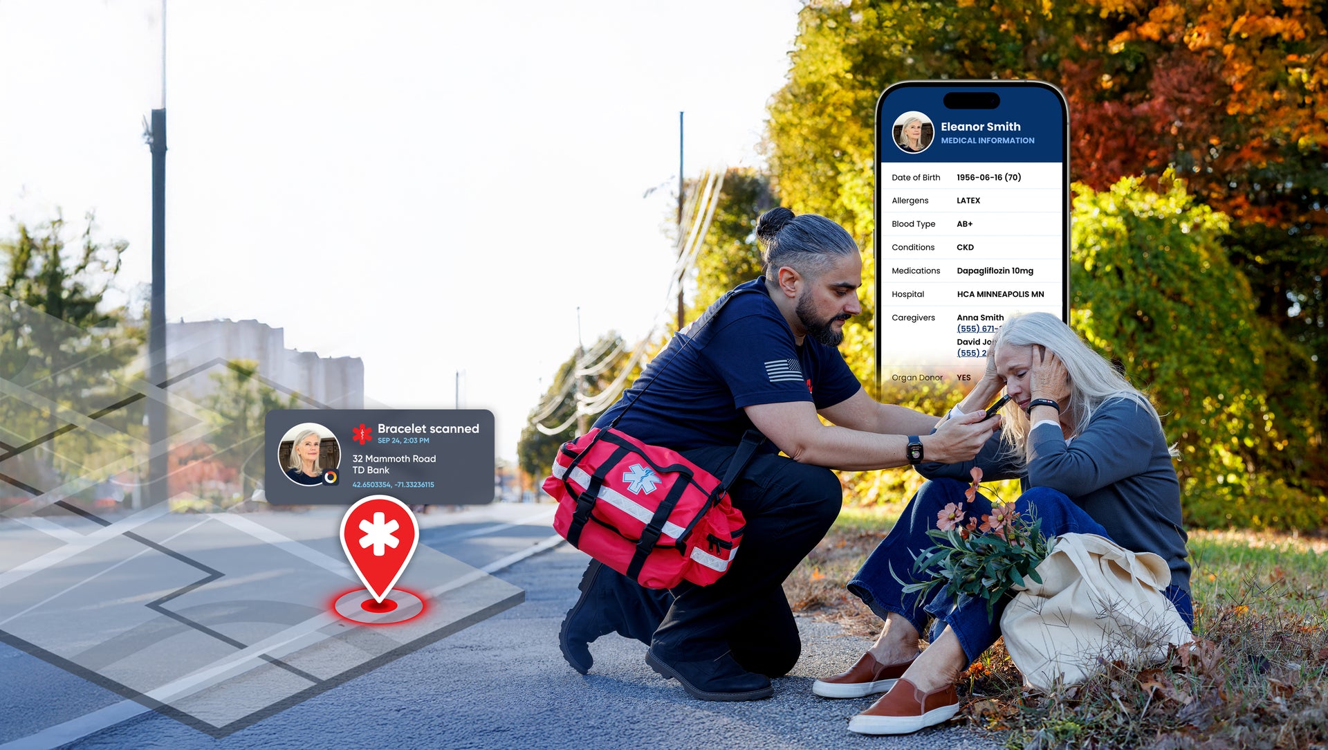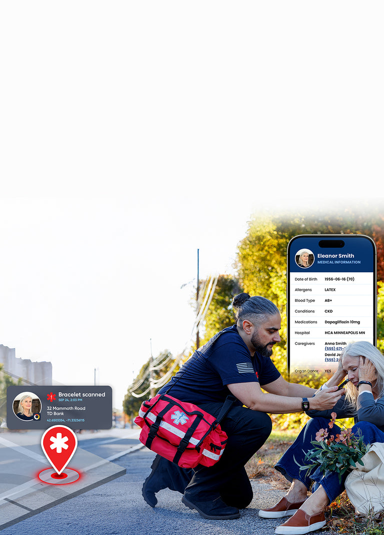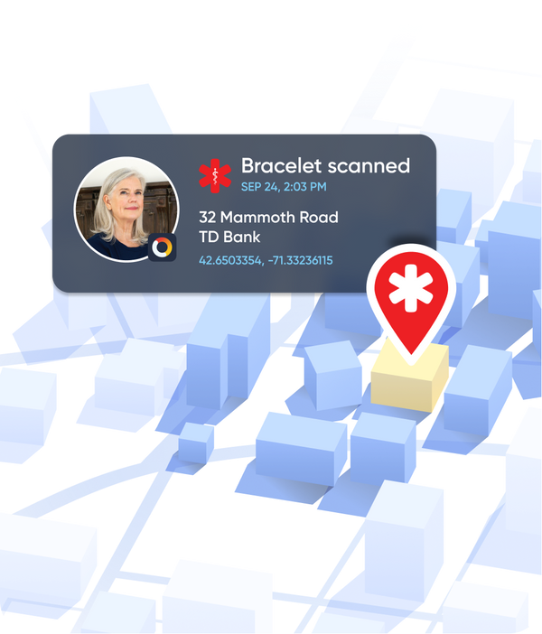 Get alerted with key information the moment your loved one needs support. Their medical details are always on their wrist, so first responders have what they need right away, and you’re notified with their location the instant the bracelet is scanned.